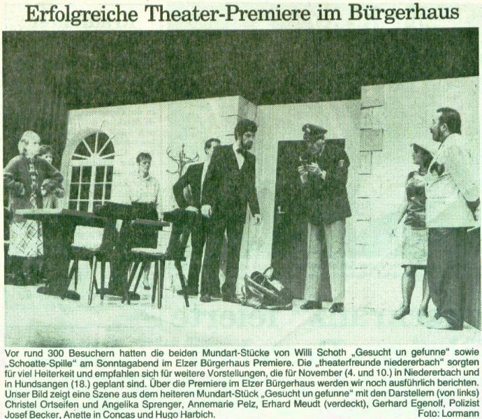 Unter der Regie von Gerhard Egenolf führten die tfn im Oktober (im Elzer Bürgerhaus) und November (in der Dorfgemeinschaftshalle in Niedererbach) zwei Stücke in Elzer Mundart auf: „Gesucht un gefunne“ und Schoattespille“. Beide Stücke wurden vom Elzer Mundart- und Heimatdichter Willi Schoth geschrieben.