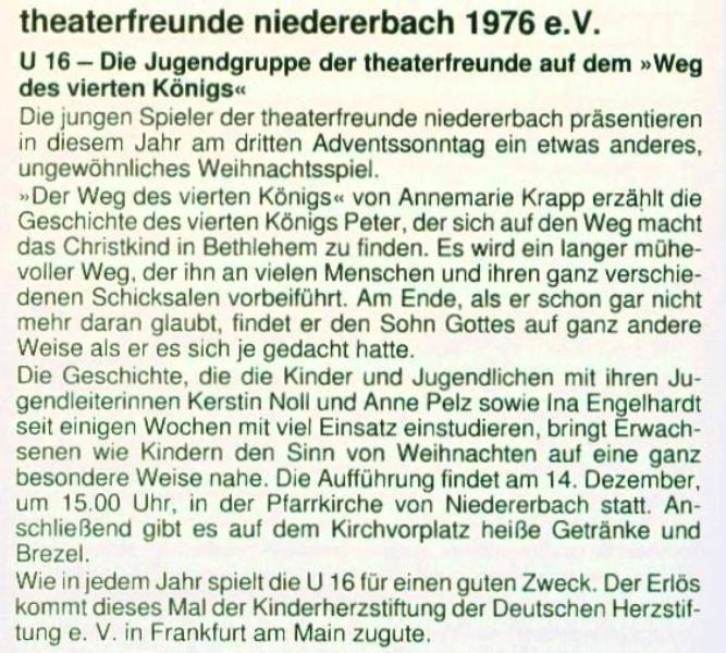 Im Dezember 1997 spielten die U16, das junge Team der tfn, das Adventsspiel „Der Weg des vierten Königs“ in der Pfarrkirche in Niedererbach. Wie schon in den Jahren zuvor war der Eintritt kostenlos. Der Erlös aus dem Verkauf von Glühwein, Kakao und Brezeln sowie die Spenden der Zuschauer kam der Aktion „Bitte helft Alex“ der Deutschen Herzstiftung Frankfurt zugute, die den kleinen Alexej Wasilijewitsch unterstützte, um dessen lebensnotwendige Herzoperation zu finanzieren.